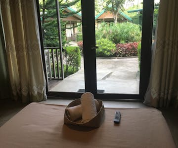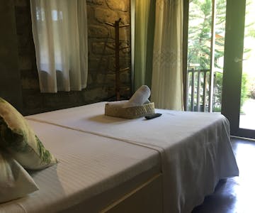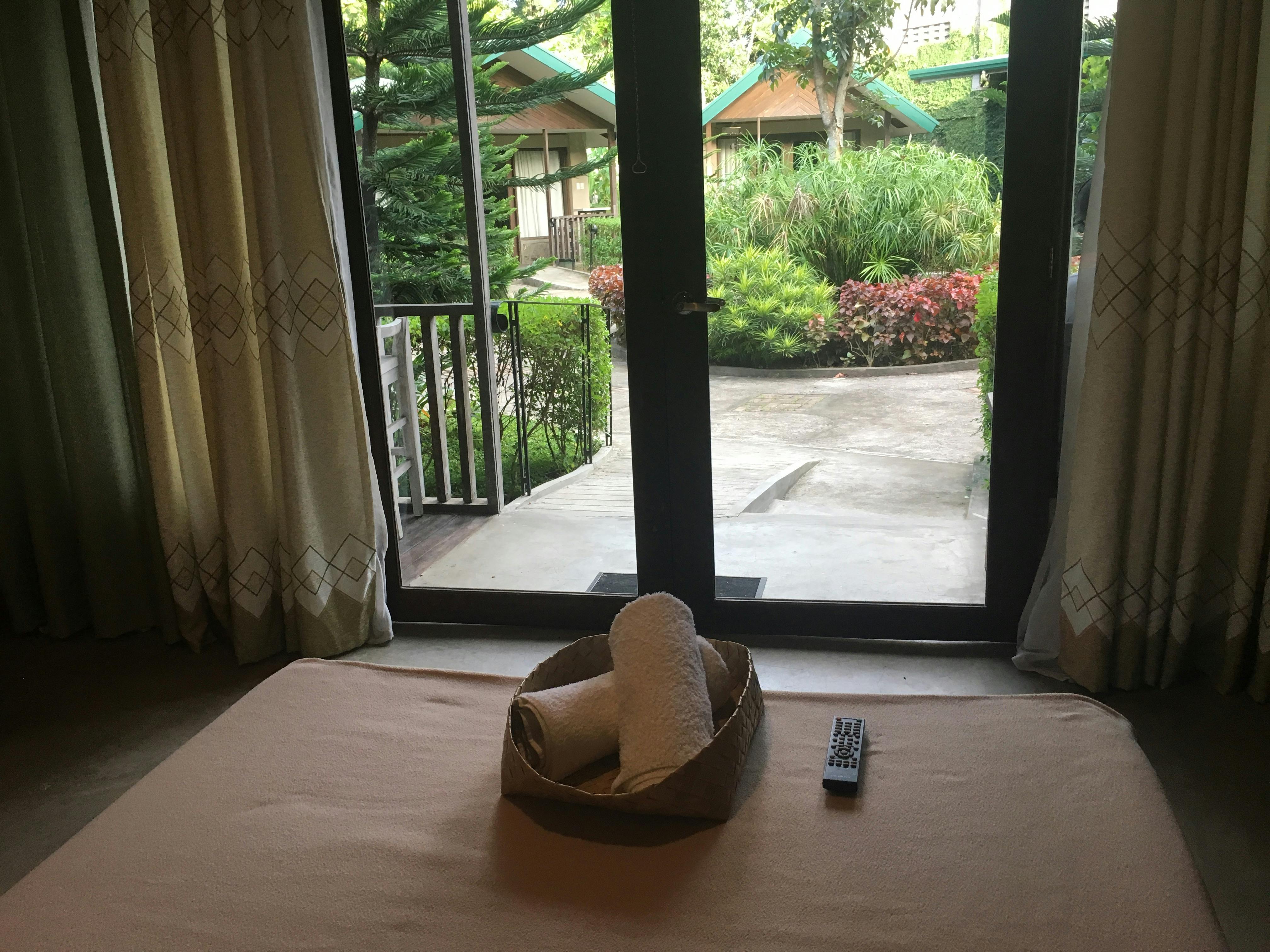Our small cabins are spacious one-bedroom rooms that are ideal for couples. The cabins are air-conditioned, with amenities like cable television and heated showers. Each cabin has its own porch with outdoor seating, ideal for lounging around or just to sit and enjoy the lush landscaping around the property. All cabins are wheelchair accessible.